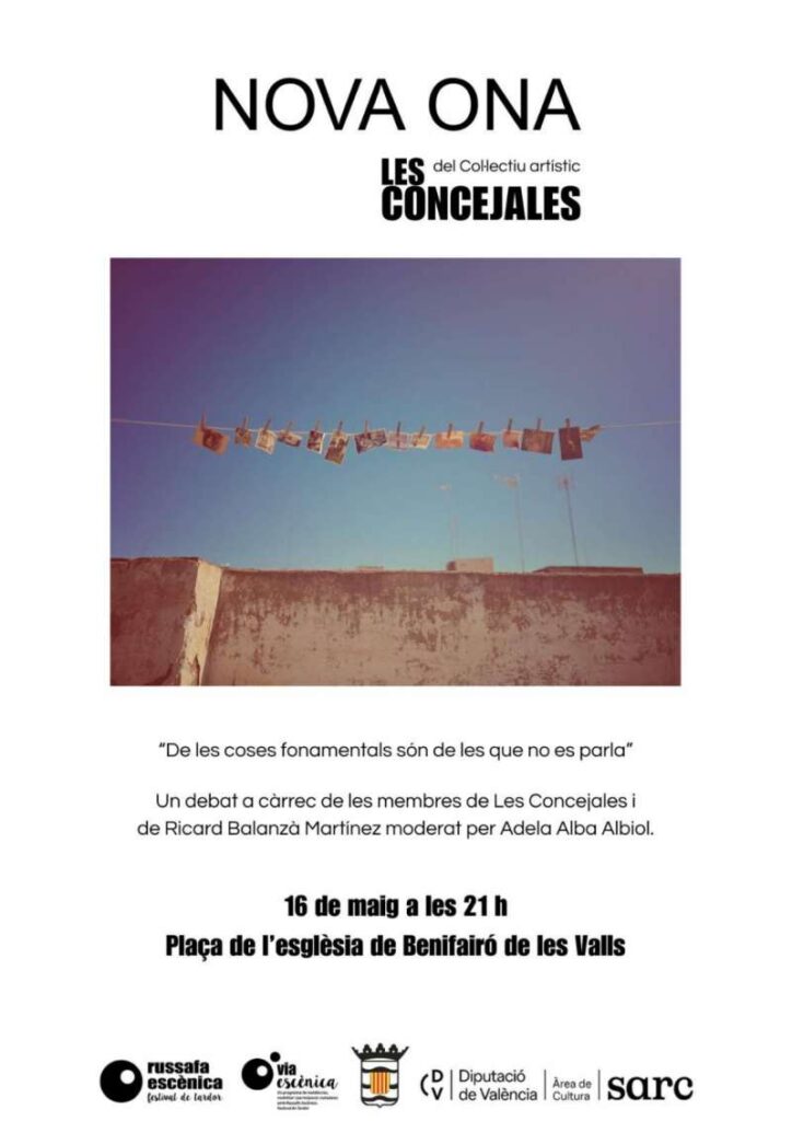 Amb motiu del Dia Internacional contra l’Homofòbia, la Transfòbia i la Bifòbia, la Regidoria de Cultura i Participació Ciutadana de Benifairó de les Valls ha programat una activitat artística i reivindicativa per a este divendres 16 de maig, a les 21 hores, a la plaça de l’Església. Es tracta de ‘Nova Ona’, un projecte escènic-participatiu creat pel col·lectiu artístic Les Consejales, que busca visibilitzar el col·lectiu cuir i les seues experiències vitals al marge de l’hegemonia normativa.